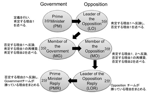 ディベートは、賛成側と反対側が交互にスピーチをすることで進んでいきます。